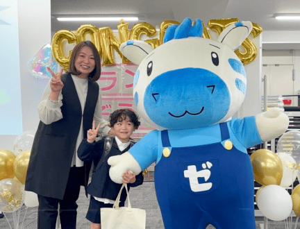 会社の福利厚生で、社員のお子さんが小学校に入学する時に、ランドセルが贈られるんだ。ぼくも全国飛び回って新1年生になる社員のお子さんたちをお祝い!